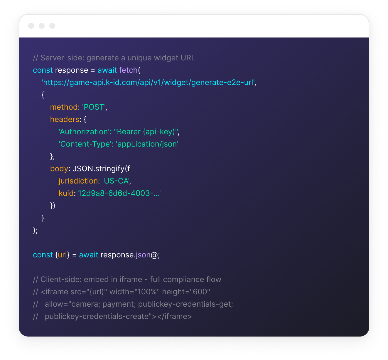 Use the End-to-End Widget for fastest integration, or build custom UX via the k-ID API. Both are powered by the same policy engine and Compliance Studio configuration.