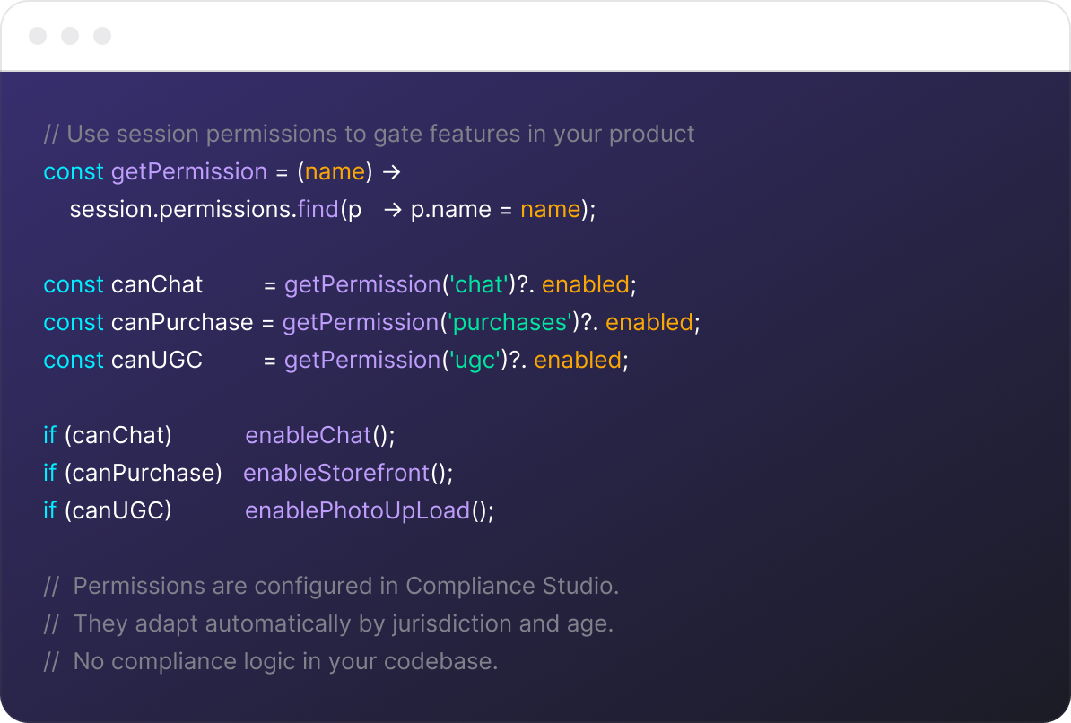One integration. CDK returns the right permissions for every user based on their age, location, and consent status.